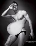 Anyway, there was no time: they wanted out! He ran to the bedroom, in order to do what his instinct was telling him, get naked, lie down and push hard. If someone had watched the scene, they could have seen the hunky, hot womanizer rip his tailored black shirt off his body, and a perfectly oval, hairless, sweaty, bronzed, gigantic stomach burst out, no longer contained by anything. No doubt he was the hottest pregnant man on earth, according to most people: according to lots of other people, he also was the most pregnant male celebrity, thanks to that absurd baby-filled boulder, sticking out an unbelievable 16 inches in front of him, hardly carried by his over-chiseled-and over-arched-back. Nobody could believe there were just twins in there, its size looking more like a triplet or quadruplet-filled belly.